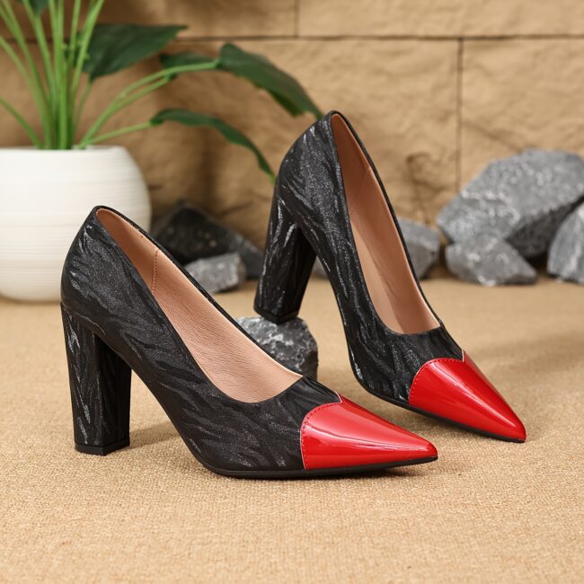 Women’S Elegant Pointed-Toe High Heels – Chunky Block Heel, Synthetic Cover, Comfortable & Stylish for Parties, Dates, and Formal Events, Red & Black, All-Season Wear, Formal Footwear | Elegant Heel Design | Synthetic Cover Shoes, Red Shoe For Women, Red
