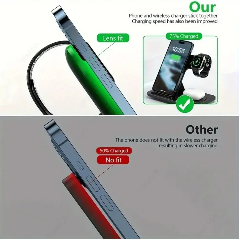 3 IN 1 WIRELESS CHARGER STAND: wireless charging station can charge your for apple iwatch 2/3/4/5/6/SE/7/8/9/10 Ultra ăCAN NOT for Samsung Watchă , Airpods Pro/2/3/4/Pro2, phones at the same time, such as for iPhone 16/16 Pro/16 Pro Max/15/15 Pro/15 Pro Max/14/14 Plus/14 Pro/14 Pro Max/13/13 Pro/13 Pro Max/13 Mini/12/12 Pro/12 Pro Max/12 Mini/11/11 Pro/11 Pro Max/SE/8/8 plus, Samsung Galaxy S25/S24/S23/S22/S21/S20/S10 series and all Qi-certified devices. Say goodbye to the messy cords, makes your desk and nightstand neatly and organized. For better charging experience, please use QC 3.0 power adapter(Not included QC 3.0 Adapter).
