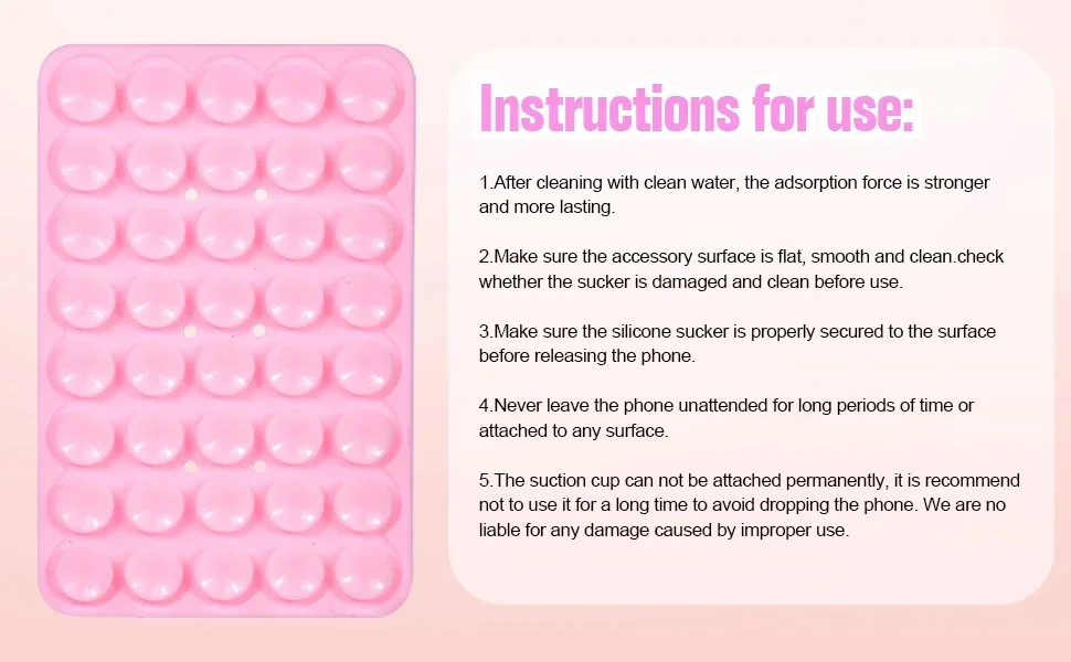 ăSuperior AdsorptionăSticky phone grip boasts 5 rows and 8 layers of independent suction cups, It offers stronger, more stable suction, so you don’t have to worry about your phone falling during use. Unlike single-sided suction cups on the market that attach to phone cases and can’t be removed, Double-sided phone suction grip can be taken off and used anytime, providing extra convenience.
