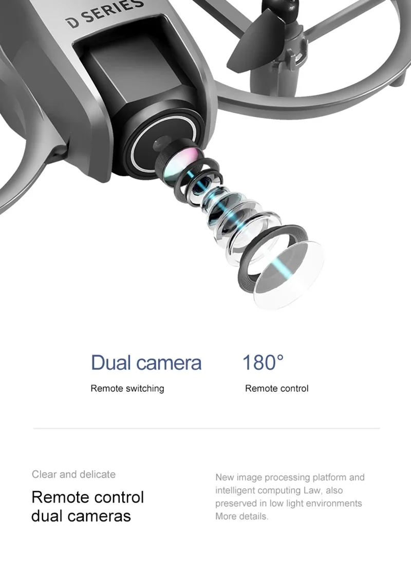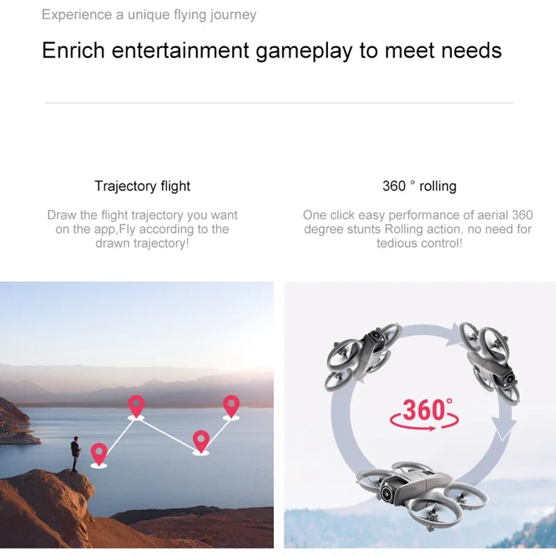 Function: Up/Down/Front/Rear, Left/Right Turn, Lateral Flight, LED Light, 360 ° Stunt Roll, Headless Mode, One Click Auto Return, Height Maintenance Mode WiFi FPV, Dual Camera Switchable, Supports Landscape/Portrait/Head Up Shooting, Camera Electric Adjustable 180 °