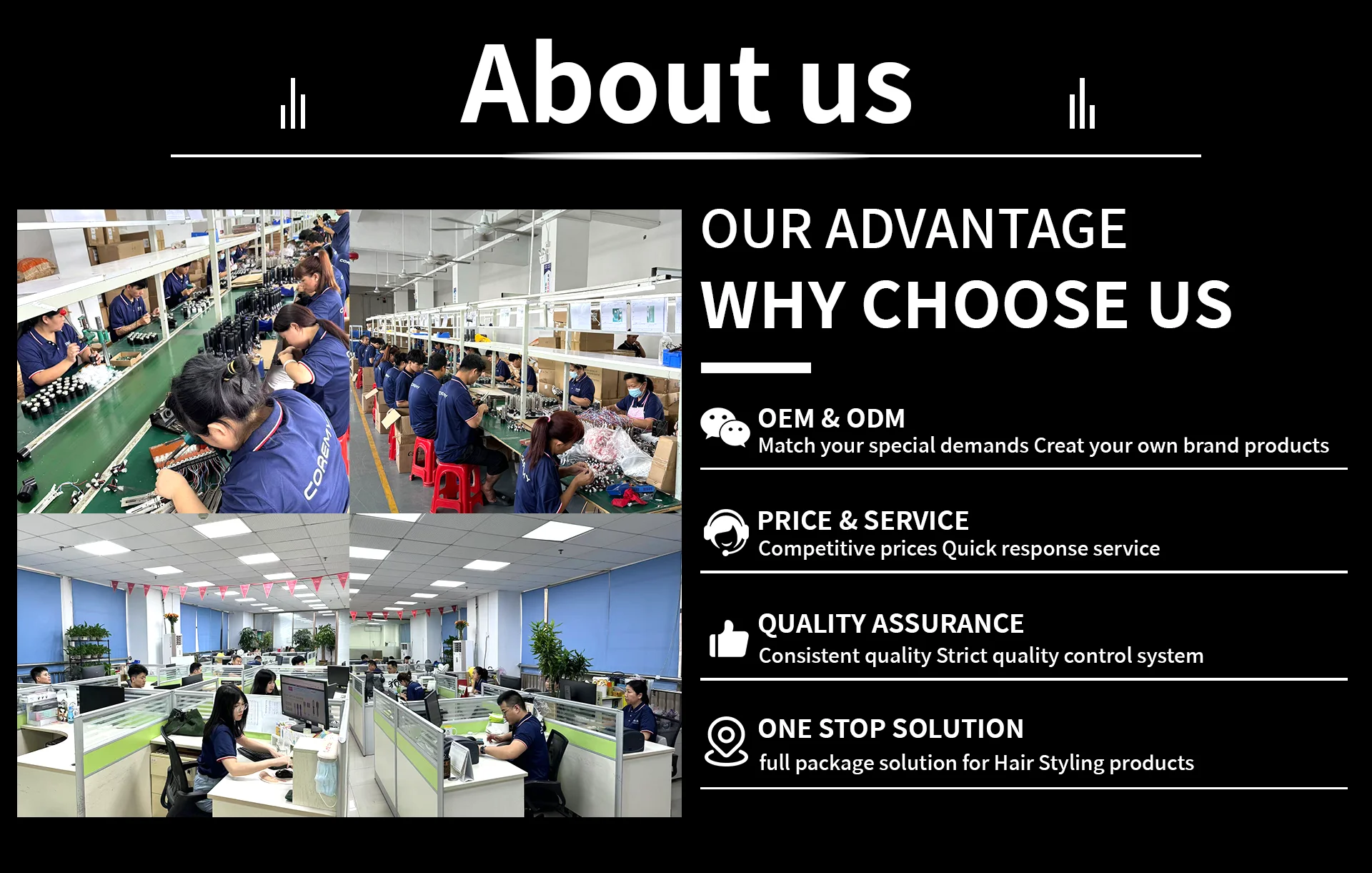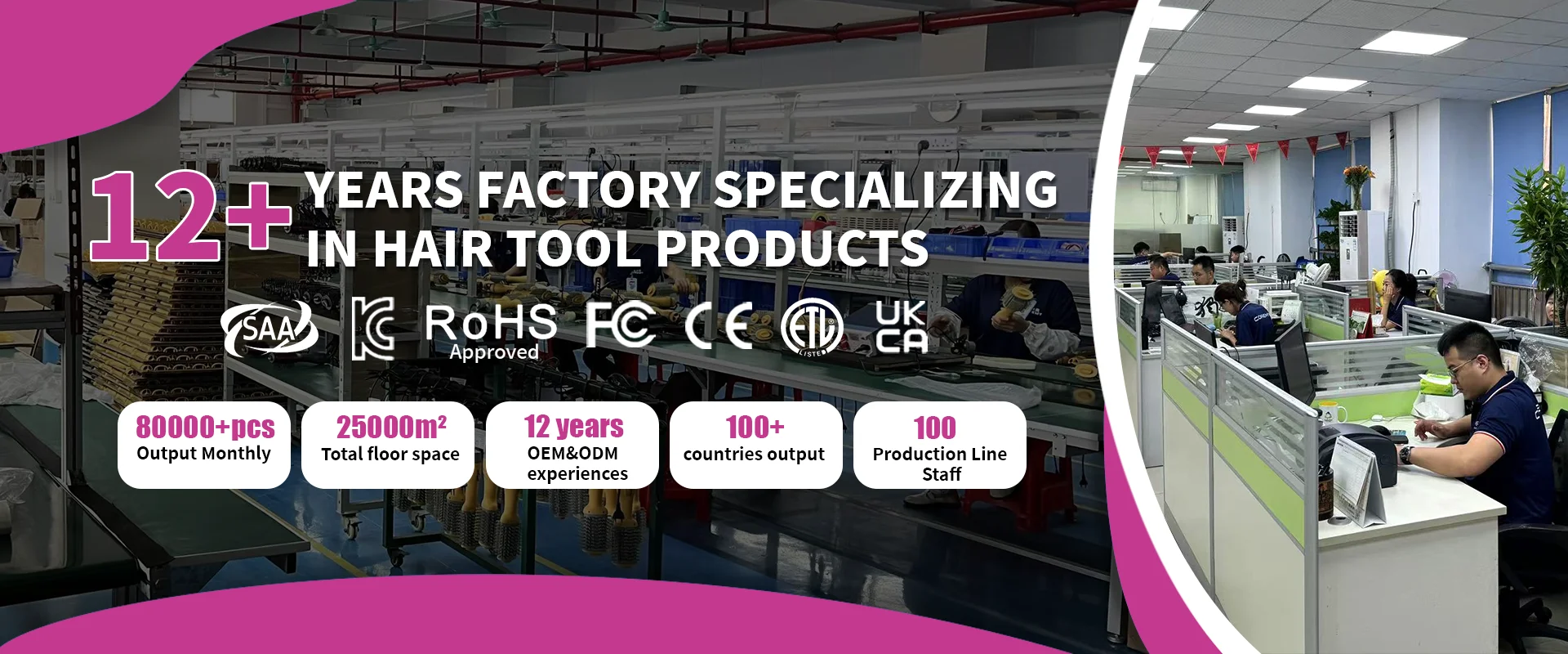 Founded in 2001, Shenzhen Coremy Technology Co., Limited is a manufacturer of hair styling tools. It is mainly engaged in the production of hair dryer brush, hair dryer, hair straightener and curler. The company has a scale of 50-100 people. It is now divided into three departments: production department, domestic sales department and foreign trade sales department. Our products are exported to Europe, South America, Australia and other countries. Company philosophy: Integrity wins the world, conscience guarantees quality. Our factory runs according to ISO 9001:2008 management system, and some of our products have UL, ETL, CE, RoHS, FCC, MSDS, CB, LVD, and other approvals. More than Eight years of OEM experience allow us to provide a detailed and delicate job for your designs and brands. We care about any feedback and will always work hard to provide fast and satisfactory service to all customers. Contact us today.