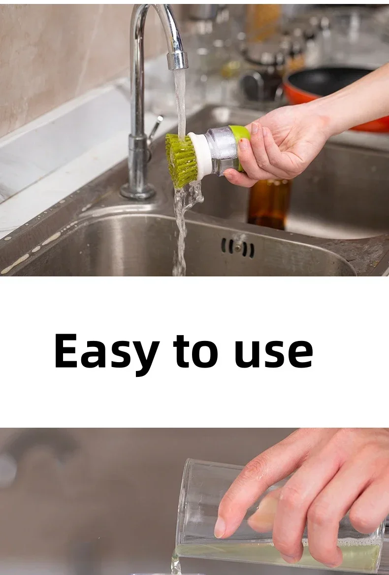 【Comes with a Storage Stand, Clean and Hygienic】Our soap dispensing palm brush comes with a storage stand, easy to storage. There are small holes on the drip tray, that can collect the water droplets inside, and the drip tray can be disassembled and discharged easily. After washing, hang it on the holder to dry it, making your kitchen clean, hygienic and easy.